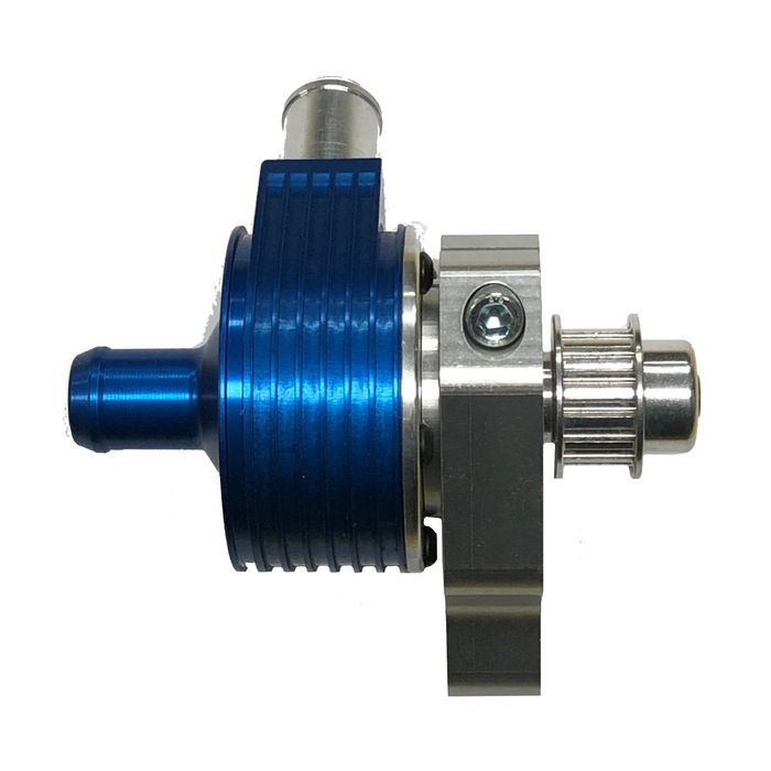 This Italian made water pump is made from billet aluminium and full CNC machined. It features a specially CNC machined propeller, adjustable angle bracket and tooth belt pulley. This inlet and outlet connections are larger than standard.