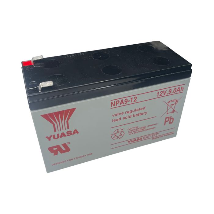 The Yuasa NPA9-12 is a 12V, 9Ah sealed lead-acid (VRLA AGM) battery with dimensions of 151 x 65 x 97.5 mm and a weight of 2.6 kg. It is a non-hazardous, non-spillable, multi-positional battery designed for high energy density and excellent cycling capability, suitable for various standby power applications. Technical Specifications: Model: NPA9-12 Nominal Voltage: 12V Capacity: 9Ah Construction: Valve Regulated Lead Acid (VRLA) / Absorbent Glass Mat (AGM) Dimensions (L x W x H): 151 mm x 65 mm x 97.5 mm (5.94" x 2.56" x 3.84") Weight: 2.6 kg (approx.) FEATURES Superb recovery from deep discharge. Electrolyte suspension system. Gas Recombination. Multipurpose: Float or Cyclic use. Usable in any orientation (except continuous inverted). Superior energy density. Lead calcium grids for extended life. Manufactured World wide. Application specific designs. Technical Features Sealed Construction Yuasas unique construction and sealing technique ensures no electrolyte leakage from case or terminals Electrolyte Suspension System All NP batteries utilize Yuasas unique electrolyte suspension system incorporating a microfine glass mat to retain the maximum amount of electrolyte in the cells. The electrolyte is retained in the separator material and there is no free electrolyte to escape from the cells. No gels or other contaminants are added. Control of Gas Generation The design of Yuasas NP batteries incorporates the very latest oxygen recombination technology to effectively control the generation of gas during normal use. Low Maintenance Operation Due to the perfectly sealed construction and the recombination of gasses within the cell, the battery is almost maintenance free. Terminals NP batteries are manufactured using a range of terminals which vary in size and type. Please refer to details as shown. Operation in any Orientation The combination of sealed construction and Yuasas unique electrolyte suspension system allows operation in any orientation, with no loss of performance or fear of electrolyte leakage. (Excluding continuous use inverted) Valve Regulated Design The batteries are equipped with a simple, safe low pressure venting system which releases excess gas and automatically reseals should there be a build up of gas within the battery due to severe overcharge. Note. On no account should the battery be charged in a sealed container.